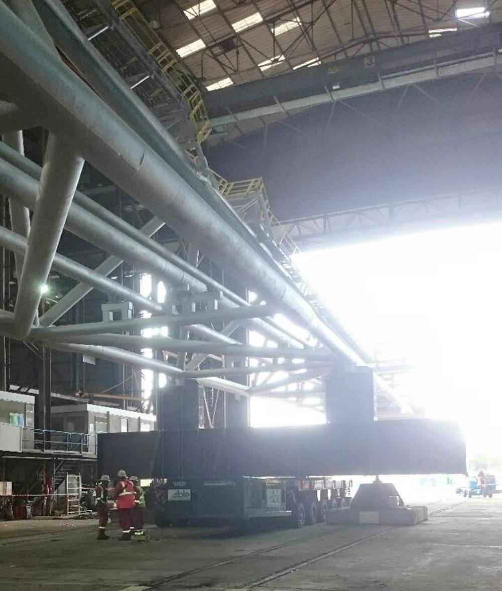 Accurate measurement of the stack was so critical that weighing was carried out under a shelter to prevent rainwater impacting the calculations. The fabrication shed in Aberdeen, Scotland had to be largeenough therefore to house the 98m-long flare stack. It took approximately five hours to complete the load out.